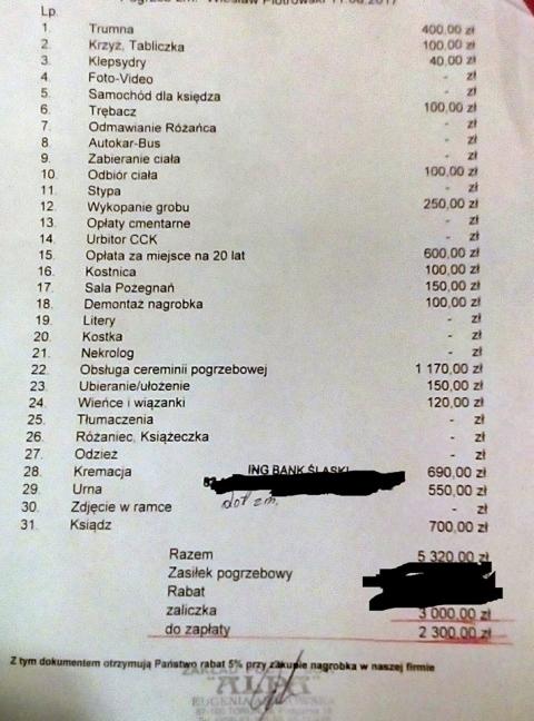 A pozniej na rachunku np. krzyz 300 zł wart 100 zł, wieniec 300 zł wart 150 zł i suma wychodzi 4-5 tys. zł |