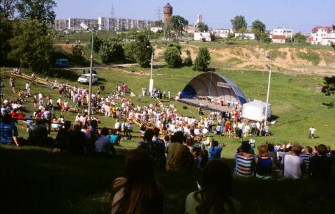 Ta rozkładana muszla z brezentu oraz drewniana scena zostały potem przeniesione do amfiteatru nad Mały Jeziorak.