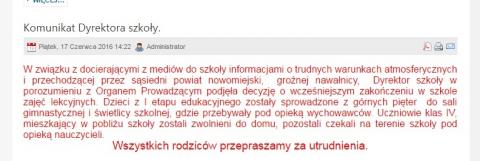 | 35352. | Odnośnie wpisu numer: 35342 Jaką logiką kierowała się dyrekcja szkoly nr 3 wysyłając dzieci do domu tuż przed burzą? Czy nie byłoby bezpieczniej przeczekać nawałnicę w szkole pod opieką nauczycieli? Nie rozumiem...