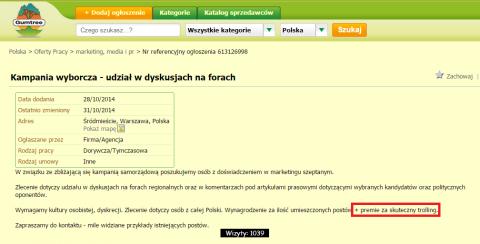 „W związku ze zbliżającą się kampanią samorządową poszukujemy osób z doświadczeniem w marketingu szeptanym. Zlecenie dotyczy udziału w dyskusjach na forach regionalnych oraz w komentarzach pod artykułami prasowymi dotyczącymi wybranych kandydatów oraz politycznych oponentów. Wymagamy kultury osobistej, dyskrecji. Zlecenie dotyczy osób z całej Polski. Wynagrodzenie za ilość umieszczonych postów + premie za skuteczny trolling. Zapraszamy do kontaktu – mile widziane przykłady istniejących postów.” |