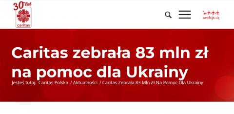 W ciągu zaledwie 2 tygodni Caritas zebrała 83 mln zł dla Ukrainy. |