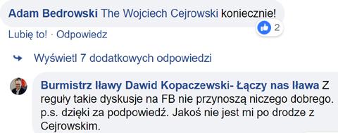 | 40229. | Odnośnie wpisu numer: 40189 Chodzą słuchy po mieście takie, że Burmistrz Dawid Kopaczewski chce się szybko pozbyć Pani Ewy Moszczyńskiej z funkcji Skarbnika Miasta, bo ta odmówiła mu zmyślania pomówień na poprzedniego Burmistrza Pana Adama Żylińskiego. [...]