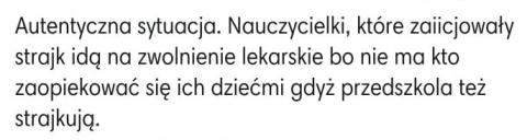 | 40236. | Odnośnie wpisu numer: 40216 Chciałem wesprzeć strajkujących nauczycieli, dlatego razem z moim synem poszedłem w piątek po pracy (pracuję do 15) do jednej ze szkół zanieść im ciasto. Pomyślałem, że wesprę ich chociaż w taki sposób. Niestety nikogo oprócz pani sprzątającej nie zastałem. Powiedziała mi, że nauczyciele swój strajk kończą tak jak pracują o 12:30.