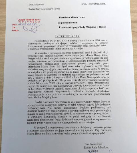Przy pomocy sztuczki prawnej (nagroda lub dodatek motywacyjny) będzie podjęta próba wypłacenia nauczycielom kompensaty wynagrodzeń za czas strajku mimo wyraźnie negatywnego stanowiska rządu, kuratoriów oraz regionalnych izb obrachunkowych (art. 23 ustawy o rozwiązywaniu sporów zbiorowych). Interpelację złożyła radna Ewa Jackowska z klubu radnych kojarzonych z PO. Jaką opinię zaprezentuje przewodniczący rady Michał Młotek? Jakie stanowisko zajmie burmistrz Iławy, Dawid Kopaczewski? Szczegóły w gazecie Kurier Iławski od środy.