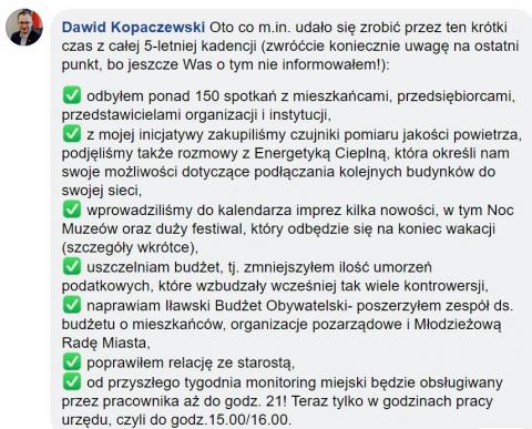 Burmistrza Dawida Kopaczewskiego wpis na „ścianie” Kuriera (Facebook) na 100 dni urzędowania: