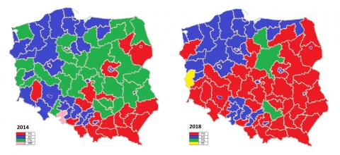Procentowa zmiana liczby uzyskanych mandatów na radnych sejmików w bieżących wyborach 2018 – w stosunku do poprzednich wyborów 2014: