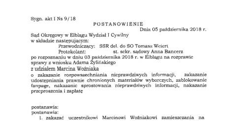 Piątek. Pierwsza taka rozprawa sądowa w trybie wyborczym! Na wniosek ADAMA ŻYLIŃSKIEGO, Sąd Okręgowy w Elblągu zakazał MARCINOWI WOŹNIAKOWI (SLD) dalszego rozpowszechniania nieprawdziwych informacji oraz nakazał ich publiczne sprostowanie na temat: