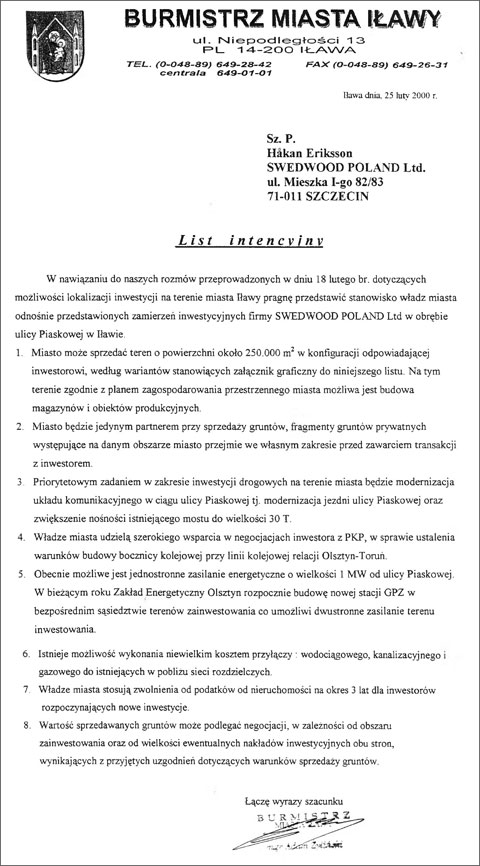 [patrz poniżej: list intencyjny burmistrza do Szwedów]