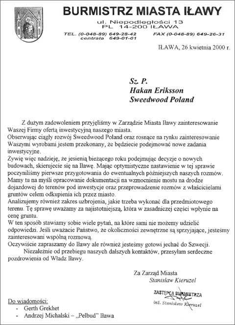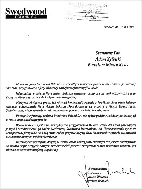 – Proszę nie spodziewać się po mnie populistycznych zapowiedzi. Nic tak nie zniechęca mieszkańców do samorządu jak uprawianie otumaniającego pijaru. Działania pod publiczkę, efekciarstwo, topornie uprawiana propaganda sukcesu, to zachowania niegodne wobec członków samorządowej wspólnoty, obrażające ich inteligencję. Jeśli zostanę burmistrzem Iławy, będę upubliczniał wszelką korespondencję „do” i „z” urzędu miasta, tę mogącą budzić zainteresowanie. Takie wzorce z powodzeniem funkcjonują w krajach skandynawskich. Tam ma to wymiar obywatelskiej edukacji, pozwala na bieżąco śledzić starania magistratu, eliminuje w ten sposób niedopowiedzenia, spekulacje, domysły, każde inne niekorzystne tendencje psujące wizerunek rozumianej jako całość lokalnej społeczności. Ten zamysł zaczerpnąłem z mojego osobistego, bardzo przykrego doświadczenia, kiedy w roku 2000 prowadziłem intensywne rozmowy z przedstawicielami szwedzkiej firmy meblarskiej SWEDWOOD z grupy IKEA, odbywając całą serię spotkań i w konsekwencji wymieniając się stosowną korespondencją. Gdybym wówczas upublicznił wymianę pism powstałych na tę okoliczność, nikt nie odważyłby się posunąć do rozsiewania na ten temat bezmyślnych pomówień mających na celu zdyskredytowanie mojej osoby. A tak, hulaj dusza, piekła nie ma. Do dzisiaj jeszcze słyszę absurdalne tezy wygłaszane na powyższy temat przez, zdawałoby się, rozsądnych ludzi. Zgodnie z zasadą „lepiej późno, niż wcale”, by raz na zawsze zamknąć ten temat, wyciągam dokumenty na stół. Proszę, kto ma ochotę, niech zajrzy i poczyta.