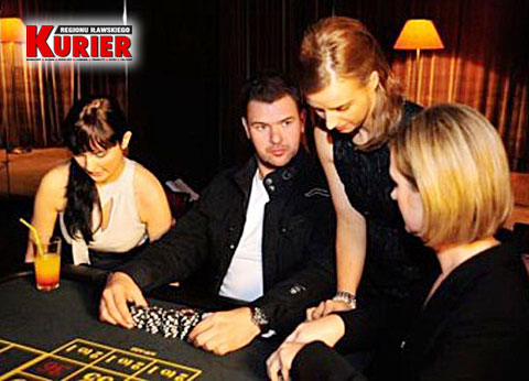 Aniela stoi przy ruletce, obok Tomasz Karolak