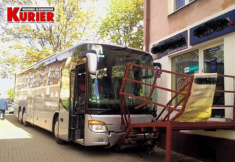 Autokar, który stoi na zatoce autobusowej, nagle zaczyna z niej zjeżdżać. Kierowca go goni, ale bezskutecznie. Pojazd kończy wycieczkę uderzając w schody kamienicy. Kierowca jest iławianiniem.