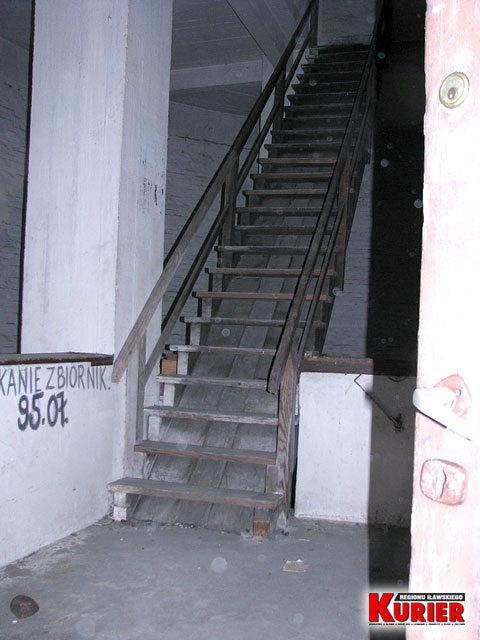 Drewniane schody wewnątrz wieży prowadzą na samą górę
