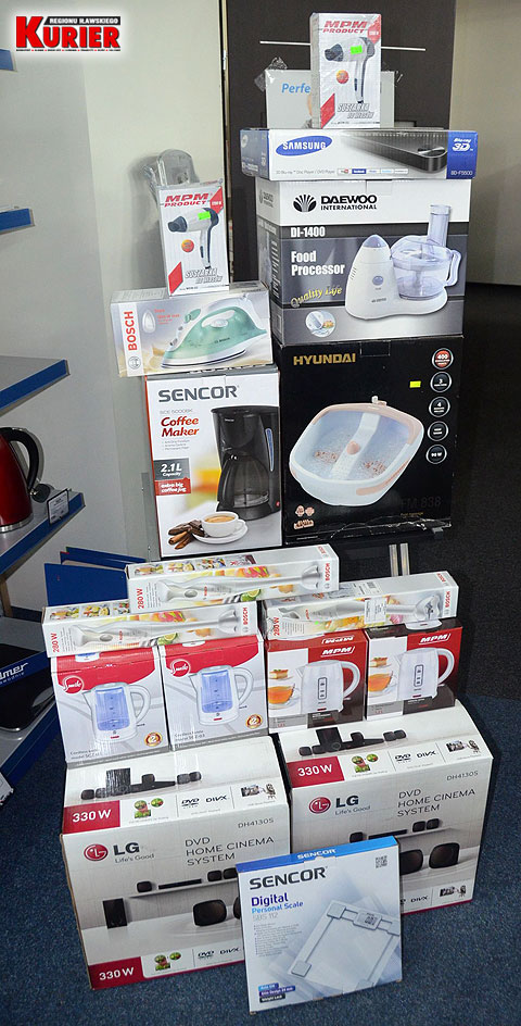 * zestawy kina domowego LG, * blender Bosch, * robot Daewoo, * żelazko Bosch, * suszarka MPM, * masażer Hyundai, * ekspres Sencor, * odtwarzacz Blu-ray Samsung, * czajnik MPM, * czajnik bezprzewodowy MPM, * waga łazienkowa Sencor
