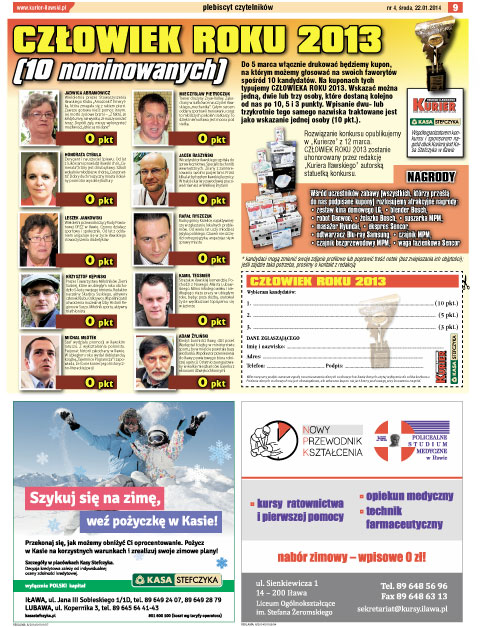 Do 5 marca włącznie drukować będziemy kupon, na którym możemy głosować na swoich faworytów spośród 10 kandydatów. Na kuponach tych typujemy CZŁOWIEKA ROKU 2013. Wskazać można jedną, dwie lub trzy osoby, które dostaną kolejno od nas po 10, 5 i 3 punkty. Wpisanie dwu- lub trzykrotnie tego samego nazwiska traktowane jest jako wskazanie jednej osoby (10 pkt.).