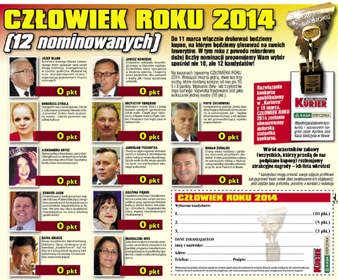 Na kuponach typujemy CZŁOWIEKA ROKU 2014. Wskazać można jedną, dwie lub trzy osoby, które dostaną kolejno od nas po 10, 5 i 3 punkty. Wpisanie dwu- lub trzykrotnie tego samego nazwiska traktowane jest jako wskazanie jednej osoby (10 pkt.).