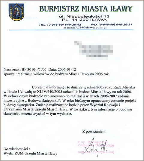 Pismo z ratusza ze stycznia 2006 r., w którym ówczesny wiceburmistrz Iławy Henryk Lisaj potwierdził, że skate park będzie gotowy w 2007 roku… I jak potem młodzi mają mieć szacunek do urzędów?