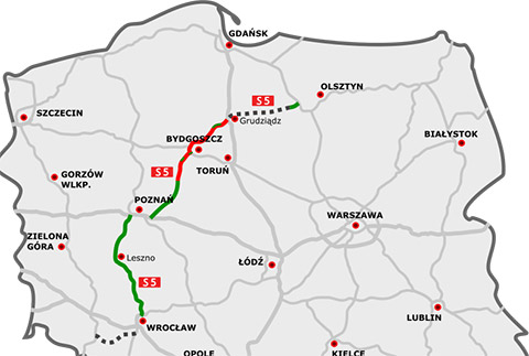 Cała droga S5 biegnie z południa na północ, łącząc Wrocław, Poznań, Bydgoszcz i Grudziądz.