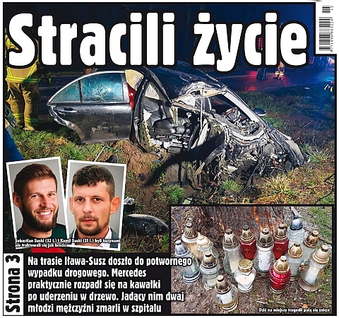 Policja komentuje śmiertelny wypadek kuzynów Sebastiana (32 l.) i Kamila (31 l.) Suskich na trasie Iława-Susz (Ulnowo, 4 kwietnia): „Kierujący mercedesem nie dostosował prędkości do warunków drogowych i po ominięciu wysepki rozdzielającej jezdnię zjechał na lewą stronę drogi, uderzając w drzewo”.