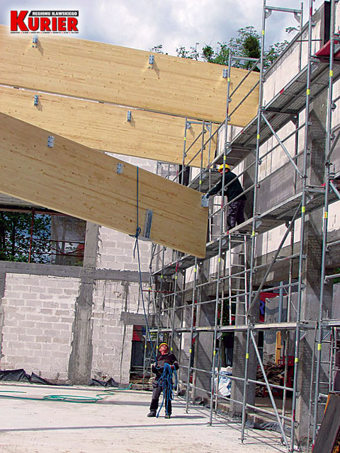 Od 15 do 19 maja w głównej części sali gimnastycznej za pomocą wielkiego dźwigu zamontowano siedem dźwigarów drewnianych i sześćdziesiąt płatwi stropowych, które stanowią konstrukcję do zamontowania pokrycia zewnętrznego dachu. Dźwigary zostały usadowione w gniazdach ścian nośnych i będą zamocowane za pomocą śrub oraz specjalnego środka.
