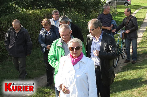 Z tyłu pechowy rower prowadzi radny Eugeniusz Dembek