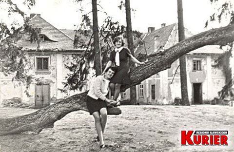 Pani Jadwiga (wyżej na gałęzi) z koleżanką. Zdjęcie z 1969 roku prezentuje w tle pałac Gardzień niedługo przed rozbiórką