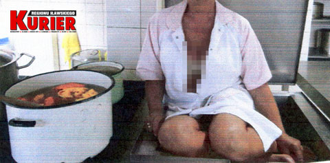 Na czterech zdjęciach widać kucharki. Jedna z nich uśmiechnięta siedzi w patelni i pozuje do zdjęć z coraz bardziej odsłoniętym dekoltem. Obok w kotle gotuje się jakaś potrawa. Druga kucharka na jednym ujęć łapie pozującą za biust.