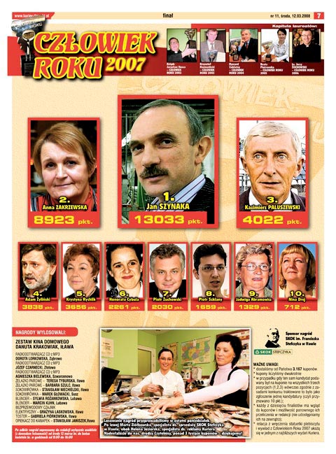 Ponad 3 tysiące kuponów dostarczyli do redakcji czytelnicy Kuriera w dorocznej zabawie plebiscytowej „Człowiek Roku”. Zwyciężył bezapelacyjnie JAN SZYNAKA, lokalny przedsiębiorca z Lubawy, znany z przejęcia i uratowania w regionie kilku niemieckich fabryk „Mazurskie Meble”.