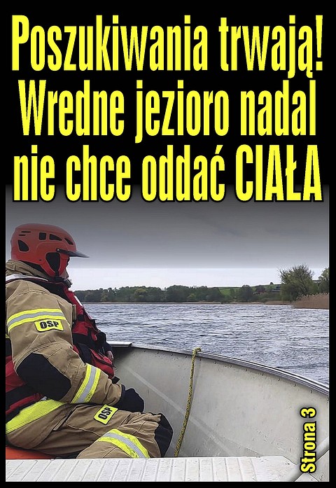 Sonary, drony, nurkowie, łodzie, specjalne psy do tropienia zwłok – przy sporym nakładzie ludzi i środków nadal trwają poszukiwania trzeciego z mężczyzn (27 lat). Wesoła kompania z początkiem majówki wypłynęła powędkować. Rozrywka zakończyła się wywrotką łodzi wiosłowej. Jeden przeżył, bo cudem doczłapał do brzegu. Drugi, wyciągnięty przez świadków i reanimowany, jednak zmarł niebawem w szpitalu. Trzeci ciągle jest szukany. Jezioro Skarlińskie w gminie Nowe Miasto Lubawskie to ogromny i niebezpieczny zbiornik wodny: obszar prawie 300 ha, długość prawie 7 km, głębokość ponad 10 metrów.