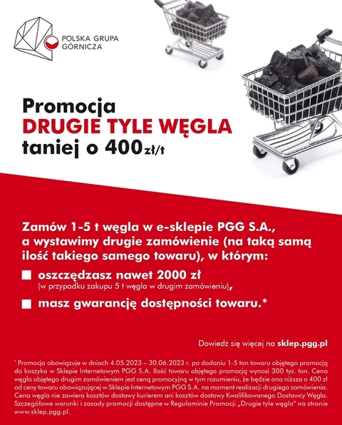 Szczegółowe warunki i zasady promocji dostępne są w regulaminie promocji „Drugie tyle węgla” na stronie sklep.pgg.pl