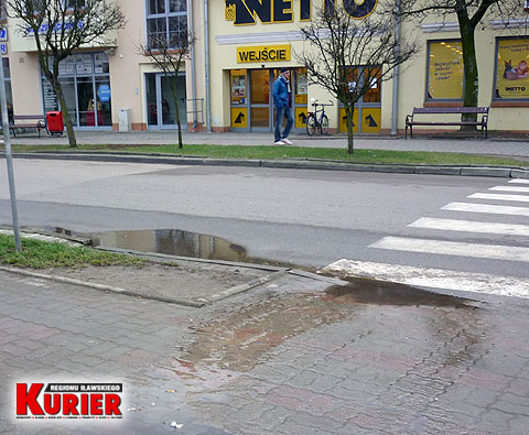 woda na ulicy 3 Maja między parkiem a sklepem zbierała się