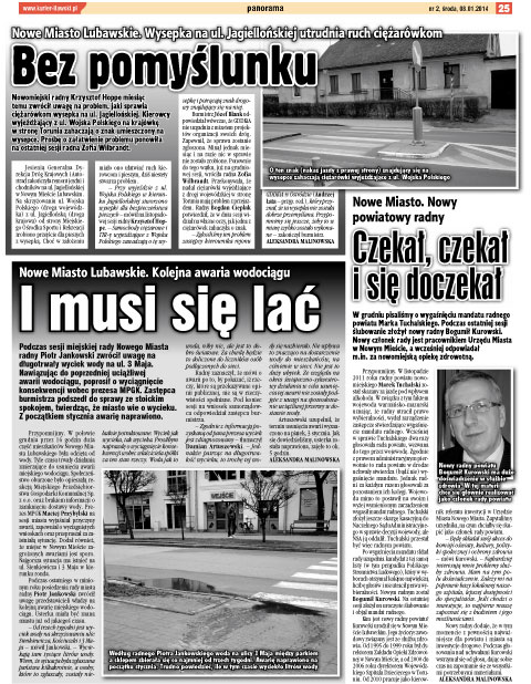 Przypomnijmy. W połowie grudnia przez 16 godzin duża część mieszkańców Nowego Miasta Lubawskiego była odcięta od wody. Tyle czasu trwały działania zmierzające do usunięcia awarii miejskiego wodociągu. Społeczeństwo oburzone było opieszałą reakcją Miejskiego Przedsiębiorstwa Gospodarki Komunalnej Sp. z o.o. oraz brakiem informacji o zamknięciu dostawy wody. Prezes MPGK Maciej Przybylski na sesji miasta wyjaśniał przyczyny awarii, zapewniał o wyciągniętych wnioskach oraz przepraszał za zaistniałą sytuację. Dodał również, że miejsc w Nowym Mieście zagrożonych awariami jest sporo. Najgorsza sytuacja ma istnieć na ul. Sienkiewicza i 3 Maja w kierunku ronda.
