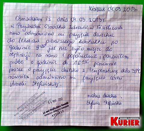 Nawet mocne lekarstwa jednak nie pomagały, dlatego po południu matka postanowiła mimo wszystko pojechać z dzieckiem do przychodni. Była godzina 16. Ponieważ nie pierwszy raz odmówiono zbadania jej córki, przygotowała na taką ewentualność oświadczenie, że dziecko nie zostało przyjęte.