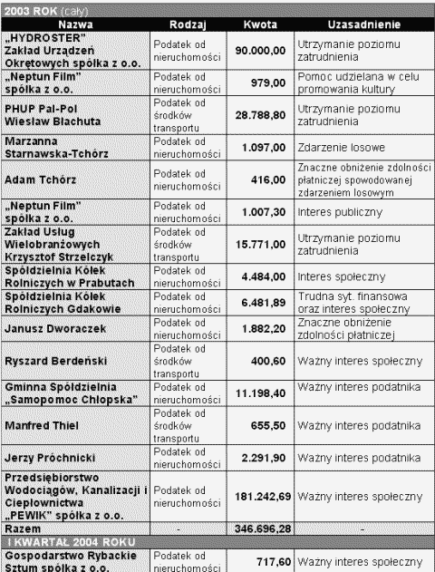Burmistrz Prabut Bogdan Pawłowski w roku 2003 umorzył podatek od nieruchomości i od środków transportu na niebagatelną kwotę aż 346.696,28 zł. Szczegóły w tabelce.
