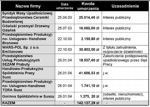 W 2003 roku burmistrz Susza JAN SADOWSKI umorzył lokalne podatki na łączną kwotę ponad 142 tys. zł. W tabeli przedstawiamy wykaz firm i kwoty.