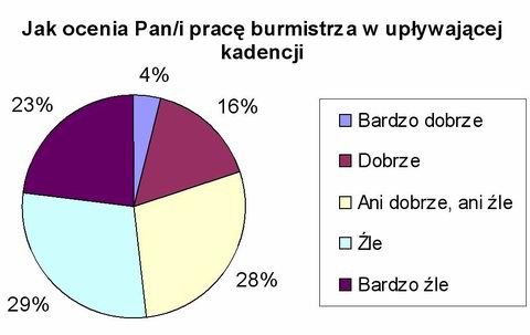 Jarosław Maśkiewicz w II turze wyborów w 2002 roku uzyskał 64% poparcia (przy 50-procentowej frekwencji). Obecnie 52% ankietowanych ocenia jego pracę jako „złą” lub „bardzo złą”. Niewiele lepszym wynikiem dla obecnego burmistrza jest 28% ocen „ani dobrze, ani źle”. Ludzki wymiar takiej oceny to „ot, jest sobie”, czyli nie zachwycająco.
