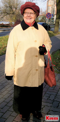 Idąc przez miasto, można spotkać ludzi, którzy są niemal identycznie ubrani. Wynika to z tego, że w sklepach bądź innych punktach sprzedaży zamawiane są te same towary – z tych samych źródeł. Pani JADWIGA z Iławy nie rzuca się na sklepowe nowości, nie stosuje się do sezonowej mody i ubiera się w to, co najbardziej lubi i jest wygodne, czyli różnego rodzaju sukienki, eleganckie buty i płaszczyk. Charakterystycznymi dodatkami do całego stroju są złote kolczyki, które fantastycznie nadają uroku oraz pakowna, czerwona torebka i bordowy berecik.