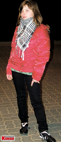 13-letnia NATALIA, mieszkanka Iławy, uwielbia nosić wszystko, co jest na czasie. Interesuje się modą i tańcem. Dziewczyna ma na sobie czerwoną kurtkę, zamiast szalika modną czarno-białą arafatkę, spodnie rurki i sportowe buty (Nike). Natalia w wolnych chwilach lubi malować paznokcie i spotykać się z koleżankami. Wyznała, że nie lubi związanych włosów.