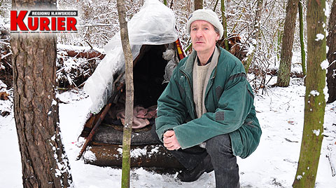 Mężczyzna od ponad ośmiu lat mieszka w szałasie zbudowanym z dywanów i kołder w lasku przy ul. Piaskowej i obwodnicy. Jak mówi, bezdomnym stał się ponad 20 lat temu, po wyjściu z więzienia, gdzie trafił za kradzieże.