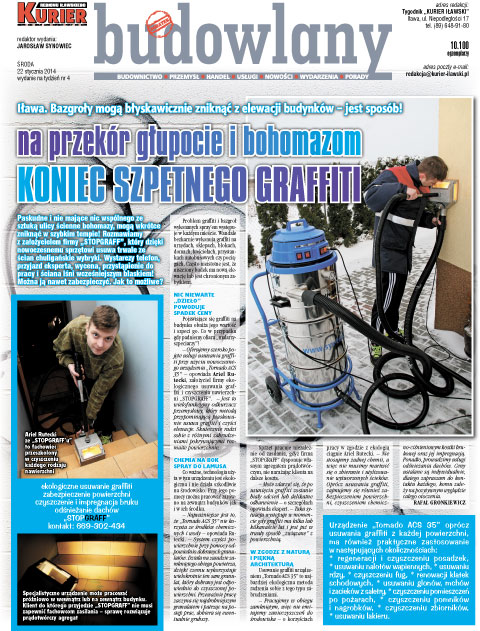 – Oferujemy szeroko pojęte usługi usuwania graffiti przy użyciu nowoczesnego urządzenia „Tornado ACS 35” – opowiada Ariel Rutecki, założyciel firmy ekologicznego usuwania graffiti i czyszczenia nawierzchni „STOPGRAFF”. – Jest to wielofunkcyjny odkurzacz przemysłowy, który metodą przypominającą piaskowanie usuwa graffiti i czyści elewacje. Skutecznie radzi sobie z różnymi zabrudzeniami pokrywającymi rozmaite powierzchnie.