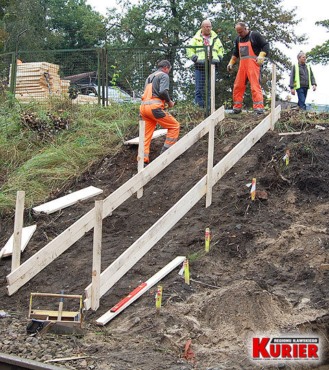 a nasypie kolejowym budowane są schody. Takie same schody
