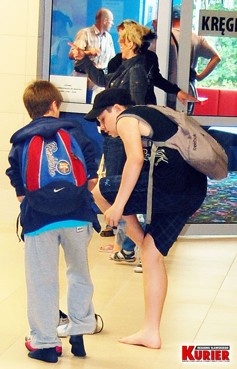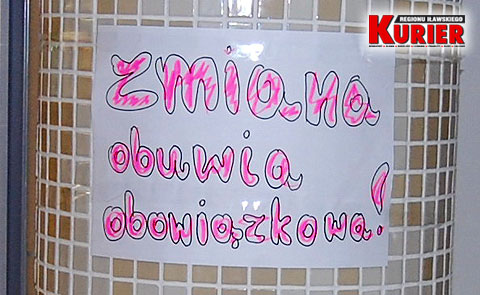 Sama wywieszka informująca o obowiązkowej zmianie obuwia wygląda raczej na malowidło dziecka, niż na tabliczkę informacyjną z obiektu zbudowanego za ponad 15 milionów zł.