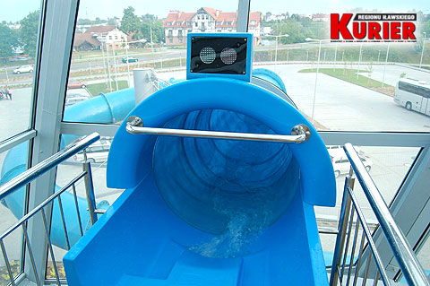 Będąc już w hali basenowej, dopatrzyliśmy się poważnej usterki, która zagraża bezpieczeństwu kąpiących się – nie działał sygnalizator świetlny na zjeżdżalni, potocznie zwanej „rurą”.
