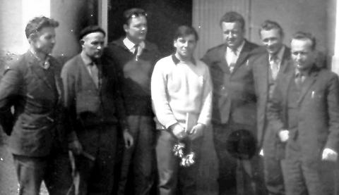 Przed jednym z nowych bloków osiedla Stare Miasto (nr 5) w Iławie (lata `60). Od lewej: Leonard Gunajew, zastępca magazyniera (dziś prawdopodobnie mieszka w Prabutach, zaprawiony żołnierz, brał udział w pochodzie na Berlin), ś.p. Bernard Rydel z Kurzętnika, majster, ś.p. Wojciech Przybylski, przedstawiciel spółdzielni mieszkaniowej „Praca”, Zbigniew Kołeczek, wówczas dobrze zapowiadający się stażysta (później dyrektor Zakładu Gospodarki Lokalami w Iławie), Romuald Zarembo, kierownik budowy, ś.p. Stefan Wołoszuk, zastępca kierownika, ś.p. Stanisław Musiał, kierownik Olsztyńskiego Przedsiębiorstwa Instalacyjno-Sanitarnego.