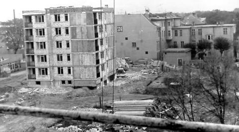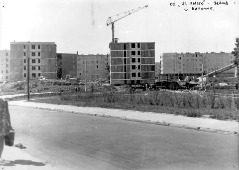 Osiedle Stare Miasto w Iławie w trakcie budowy, widok od ul. Konstytucji 3 Maja. Dla orientacji: po prawej widoczny podajnik paliwa do kotłowni (dziś jest po niej pusty plac i ogrodzone boisko do gry).