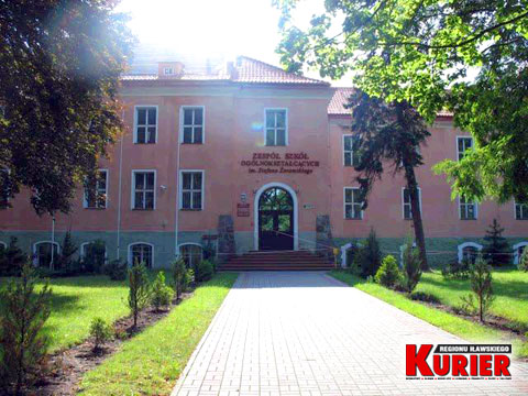 Główne wejście do iławskiego LO, pierwsze dwa okna z lewej strony na wysokim parterze to gabinet dyr. Żuchowskiego