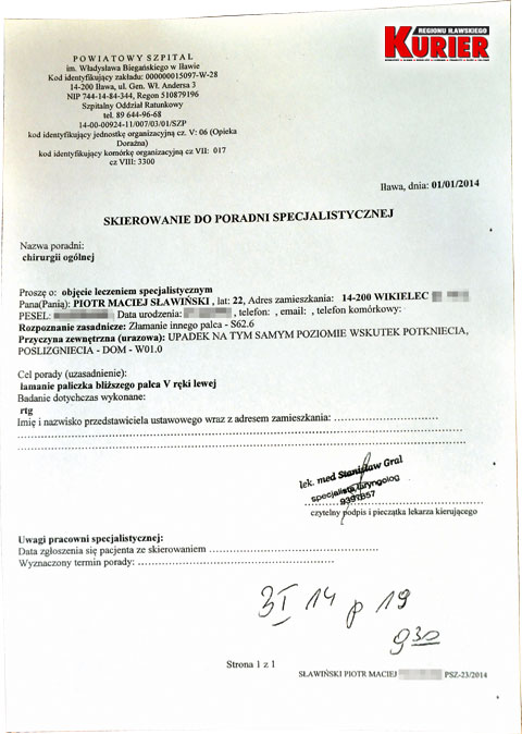 Gdy dojechaliśmy do szpitala, czytelnik znów zadzwonił. Tym razem poinformował, że lekarz przyjął go o godz. 11:24, ale tu pojawił się kolejny problem. Otóż Sławiński nie uzyskał żadnej pomocy, ponieważ lekarz przyjmujący powiedział mu, że z takim urazem powinien trafić nie do chirurga ogólnego, a do ortopedy. W efekcie dostał kolejne skierowanie, a do specjalisty trafił sześć dni później.