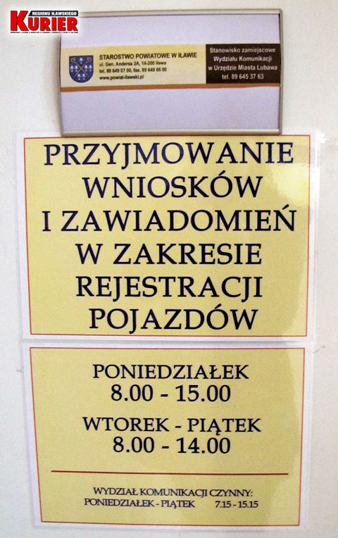 W godzinach pracy wydziału komunikacji w Iławie interesanci również nie załatwią wszystkich spraw. Podobnie jak w Lubawie stosowna informacja jest zamieszczona na drzwiach wejściowych. W poniedziałki pracownicy pracują od 7:15 do 16. Przyjmowanie wniosków i zawiadomień dotyczących rejestracji pojazdów ma miejsce od 8 do 15:30. W pozostałe dni tego typu formalności można załatwić w urzędzie między 8 a 14, choć godziny pracy to 7:15-15:15. Z innymi sprawami do wydziału można zgłaszać się w czasie urzędowania.
