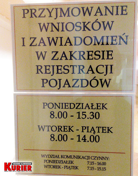 – Ogłoszenie informuje, że godziny pracy to 7-15, a poniżej jest informacja o przyjmowaniu od godziny 8 do 14 – pisze czytelnik. – Wielu kierowców chcących załatwić sprawę zwraca uwagę na godziny otwarcia, a nie na opis poniżej o przyjmowaniu interesantów.