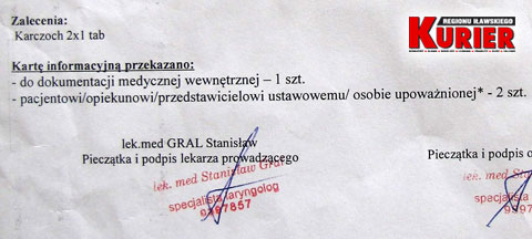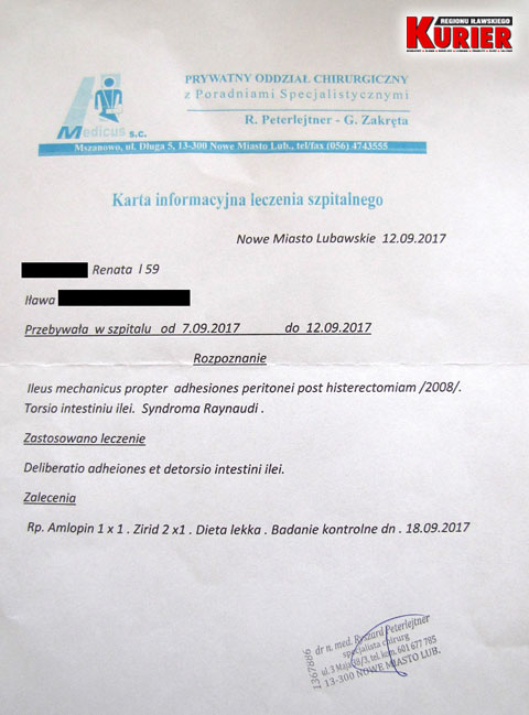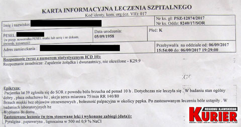 – Zdecydowano, że mogę wrócić do domu – kontynuuje pani Renata. – Czekaliśmy na wypis 2 godziny, bo nie było prądu w szpitalu. Napisali w nim, że mam zapalenie żołądka i dwunastnicy. Nie wiem, na jakiej podstawie tak stwierdzono. Zalecono mi też jedzenie karczocha w tabletkach. W domu około pierwszej w nocy rozpoczęły się wymioty. Męczyłam się, ale powiedziałam sobie, że wytrzymam i zgłoszę się do lekarza rodzinnego.