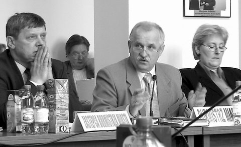 Modły wiceburmistrza Henryka Lisaja (po lewej) nie przyniosły skutku: burmistrz Jarosław Maśkiewicz nie dostał absolutorium za wykonanie zeszłorocznego budżetu. Obok skarbnik Janina Okołowska, która – choć z ust radnych zebrała same dobre noty – skóry swojemu szefowi nie uratowała.